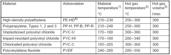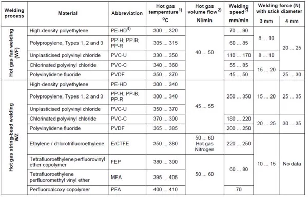 Bảng thông số hàn với kiểu hàn khí nóng