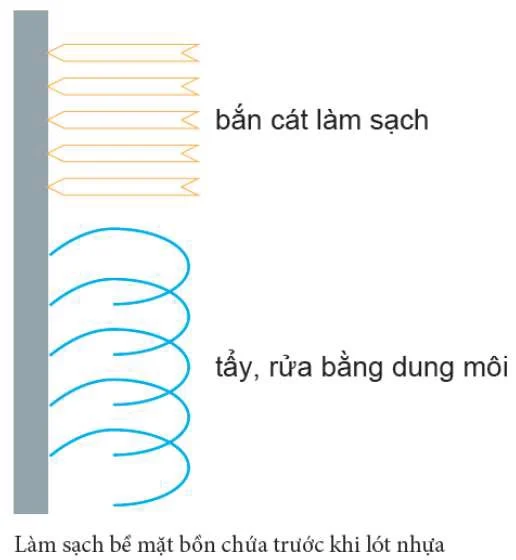 Trước khi lót nhựa, bề mặt lót cần được làm sạch, có thể dùng máy bắn cát áp lực, hoặc nước áp lực cao để làm sạch bề mặt. Cần đảm bảo rằng bề mặt gắn nhựa được làm sạch, nhẵn, không còn gỉ sét, bám cát, bụi, bẩn, có thể làm sạch bằng đánh giáp, bàn chải, rồi dùng máy hút bụi để làm sạch bề mặt bồn trước khi lót nhựa.