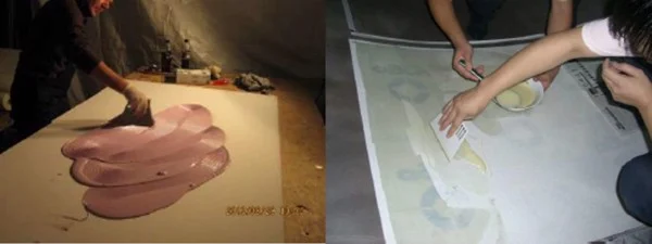 Dàn đều keo dán lên toàn bộ bề mặt của tấm nhựa cần lót, đảm bảo không sót vị trí nào chưa có keo. Sau đó nhanh chóng đặt tấm nhựa vào vị trí đã đánh dấu ở bước trên, đặt các dụng cụ như lưới PE, màng nilon, giác hút chân không vào đúng vị trí và căng đều tấm màng nilon về các phía rồi dính chặt vào các mặt trên của phần băng dính 2 mặt đã dính lên băng dính giấy trước đó.