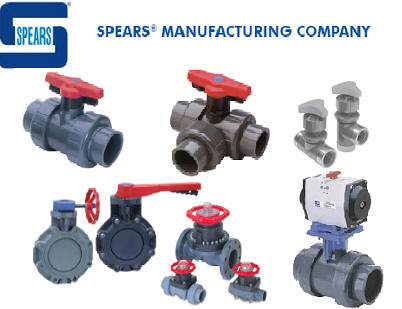 All thermoplastic ball valves shall be True Union 2000 3-Way [specify horizontal or vertical] type with [specify port option] manufactured to ASTM F 1970 and constructed from PVC Type I, ASTM D 1784 Cell Classification 12454, or CPVC Type IV, ASTM D 1784 Cell Classification 23447. All O-rings shall be EPDM or FKM. All valves shall have Safe-T-Shear® stem with double O-ring stem seals. All valve handles shall be polypropylene with built-in lockout mechanism. All valve union nuts shall have Buttress threads. All seal carriers shall be Safe-T-Blocked®. All valve components shall be replaceable. All EPDM valves shall be certified by NSF International for use in potable water service. All PVC and CPVC 1/2" through 2" valves shall be pressure rated to 235 psi, all 2-1/2" through 4" and all flanged valves shall be pressure rated to 150 psi for water at 73°F as manufactured by Spears® Manufacturing Company.